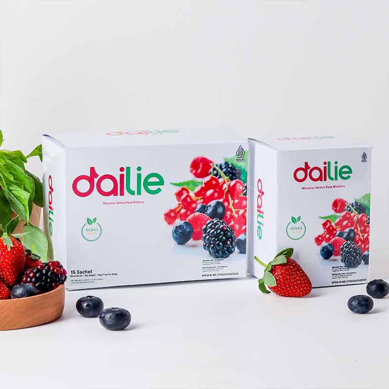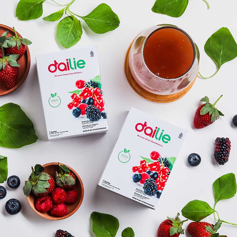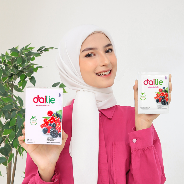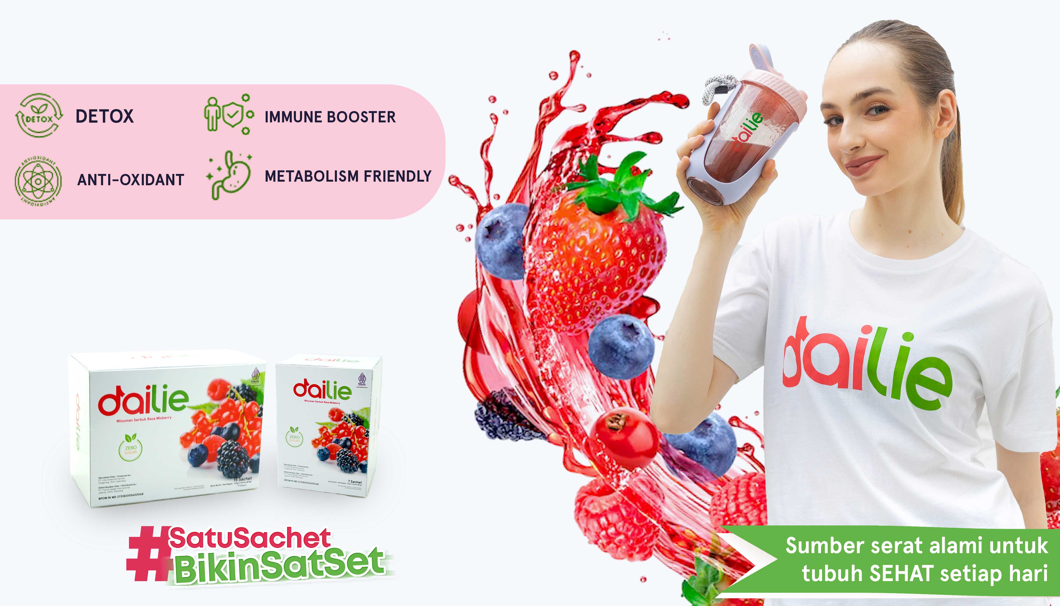 Dailie 3 in 1 – Detox, Antioxidant and Immune Booster Fiber. Mengandung psyllium husk, extract mix berry, inulin, red beet, ascorbic acid, guarana, spinach powder serta mix fruit and vegetable.